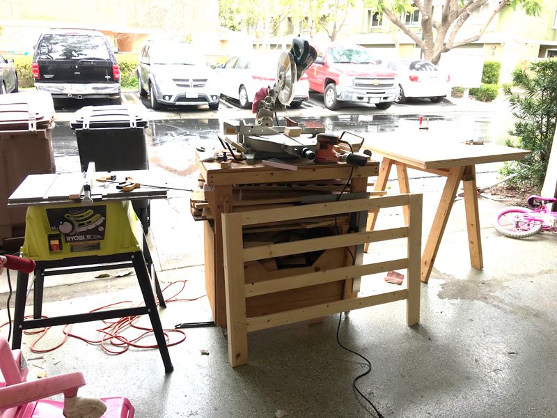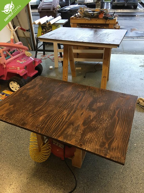 Below you can see the stained ply wood with the 1×2 white square frame attached to the bottme. This is what I attached the legs and sides to.